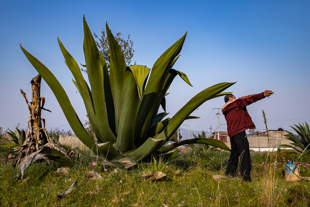 Por las descripciones que sobre los magueyes puede dar un tlachiquero, parecería que en realidad se refiere a una persona. Para un tlachiquero el maguey hace cosas propias de la gente: salta, llora, escucha, tiene cara y corazón. “Das pulquito” le dicen, acariciando sus pencas, durante los largos años que toma cultivarlos. “Con tu permiso, te voy a raspar” o “gracias por el aguamielito”, en las dos ocasiones diarias que los visitan para recolectar el aguamiel, sus lágrimas. Cuidan a sus magueyes como si de un rebaño se tratara. Y los magueyes ahí están, en efecto, en medio del campo o a la orilla de la milpa, como colosales estrellas verdes de cien puntas. Rodeados de hierbas y flores hacia el final del verano. Henchidas las pencas de savia y abiertos como manos que ofrecen al sol la plenitud de su carne oscura. Estoicos. Los mira uno y entonces cobra sentido oirle decir a un tlachiquero “ahí como lo ve, el maguey es como una persona que está creciendo”.