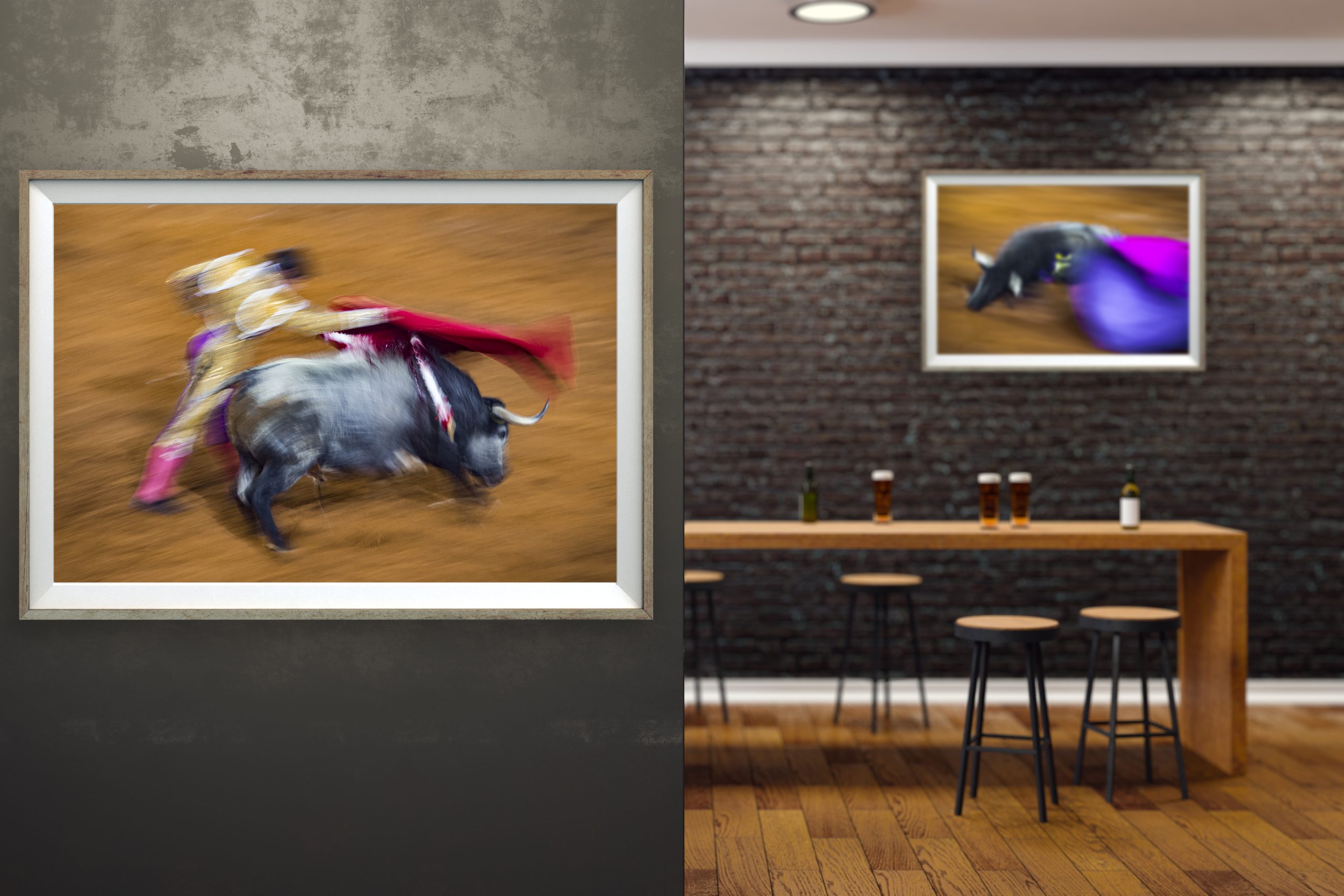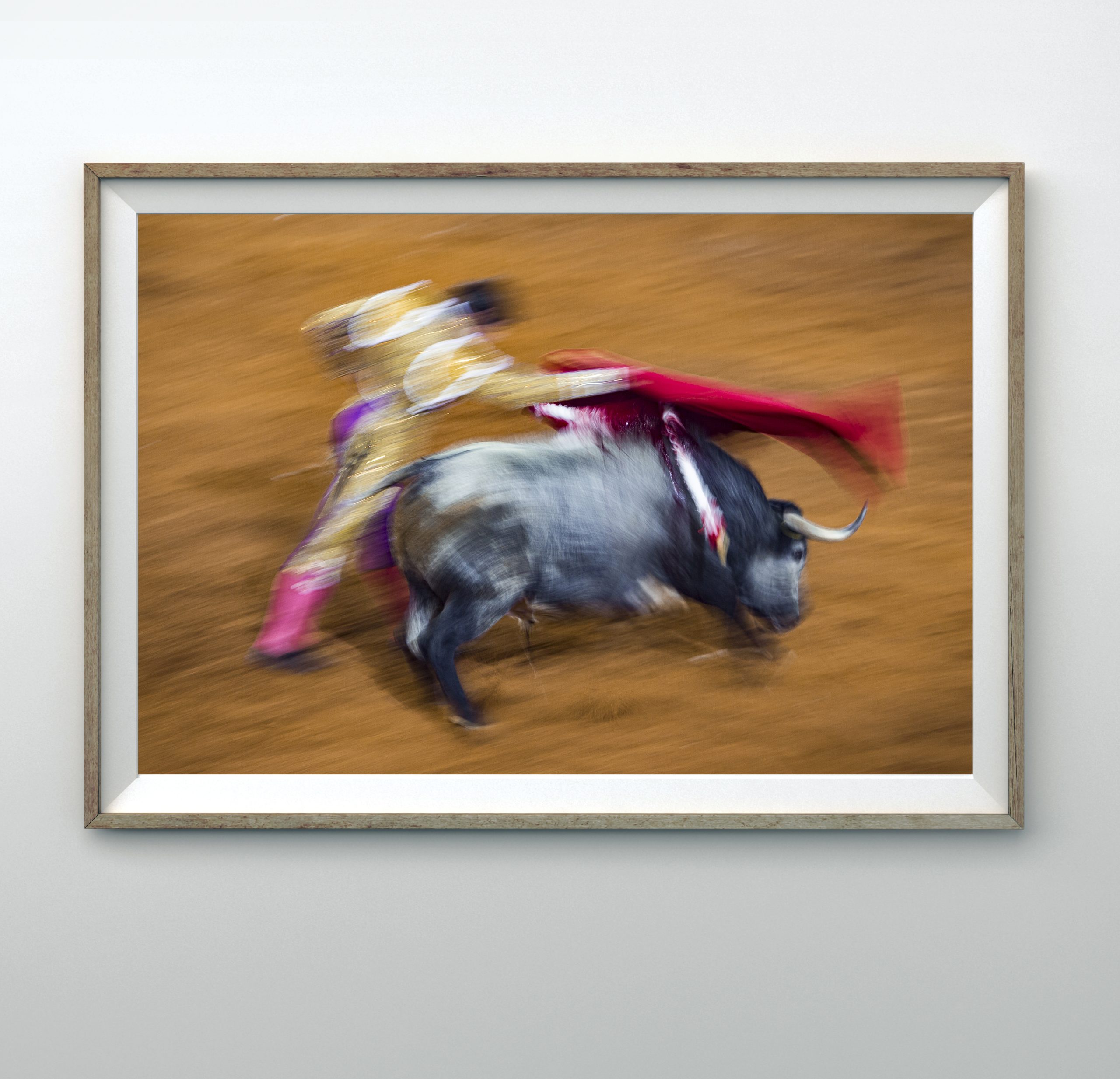 La pieza “Pase de muleta” recrea la delicada coreografía entre el toro y el torero. El instante permanece suspendido bajo el delicado velo que supone la muleta, posada sobre las astas de la bestia en un movimiento acompasado por el torero.